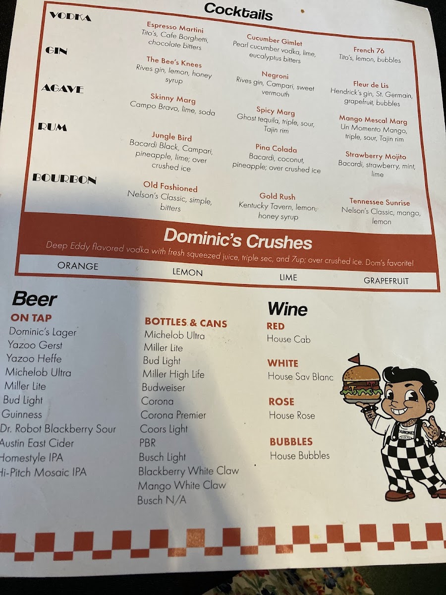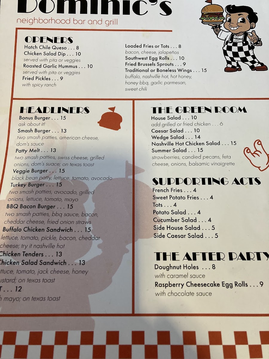 Don't forget to check out the merch, like the classic red coffee mug for $10.00 or the stylish DTH tees for $20.00 that make perfect souvenirs. With friendly service and a welcoming vibe, Dominic's Bar & Grill is certain to become a favorite destination for great food and family fun.